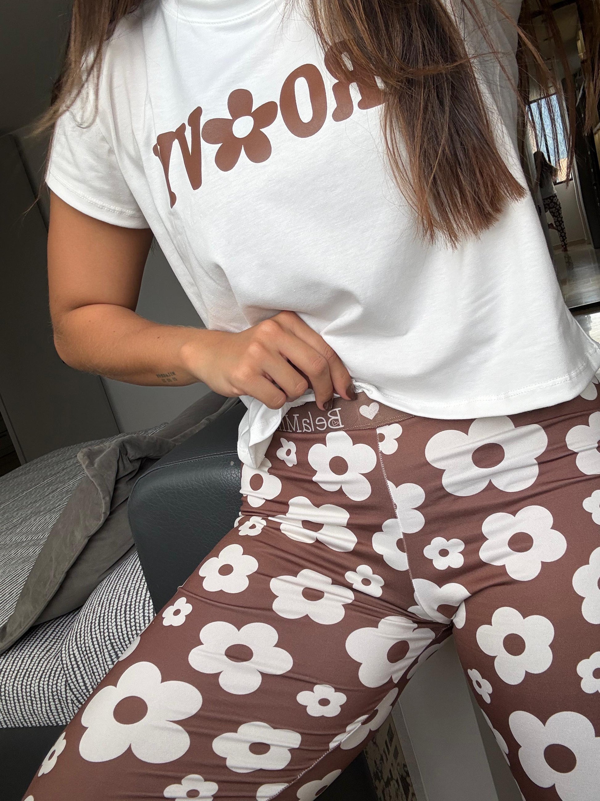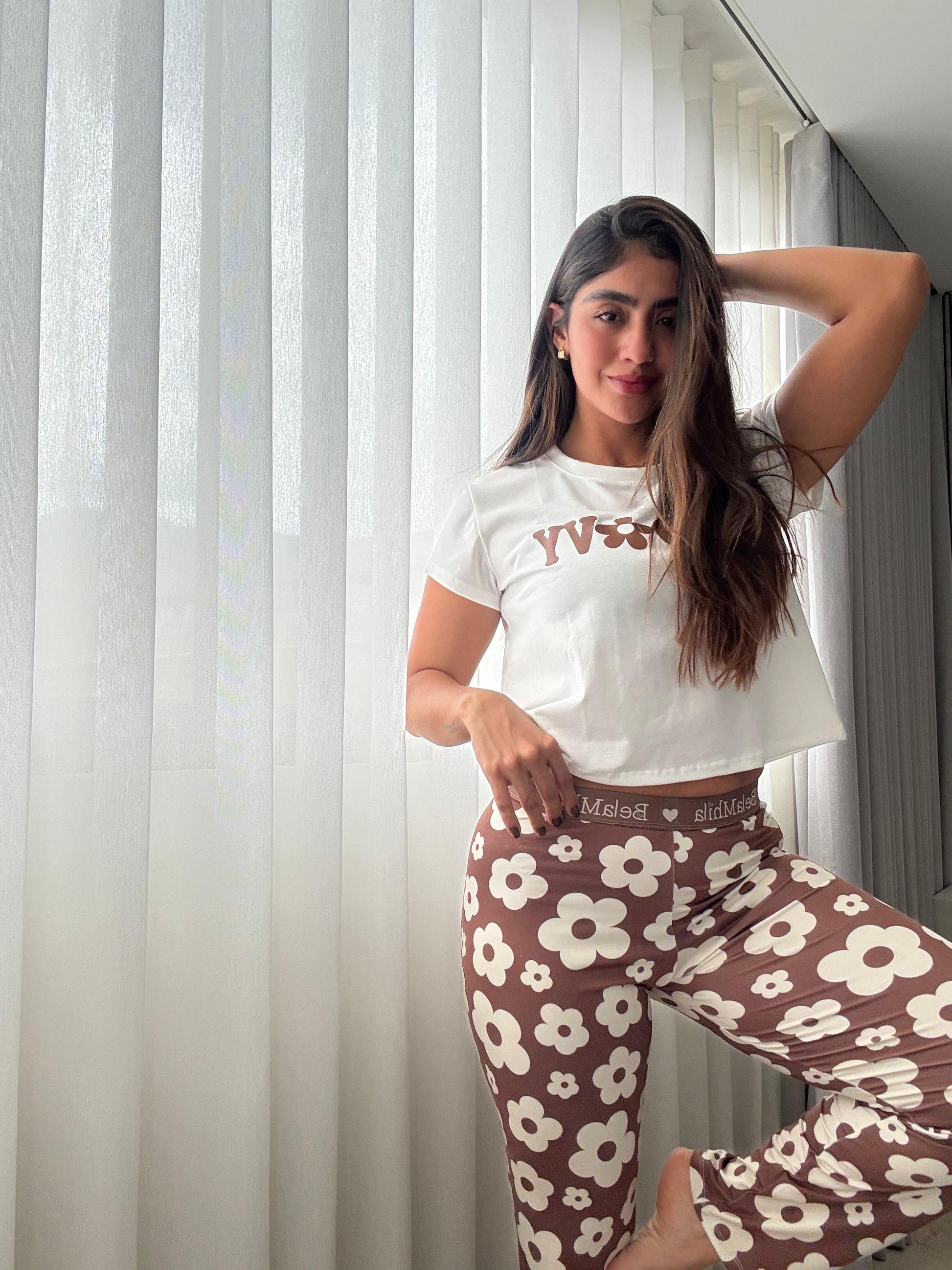 Emily combina lo mejor del confort con el estilo más auténtico de BelaMhila. Su pantalón en tela piel de durazno con estampado floral y camiseta crop en polialgodón crean el balance perfecto entre comodidad y diseño.